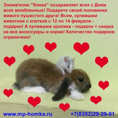 Зоомагазин "Хомка" поздравляет всех с Днем всех влюбленных! Подарите своей половинке живого пушистого друга! Вас ждут наши крольчата пород рекс, вислоухий, короткоухий, хомяки сирийские и джунгарские разных окрасов, свинки шелти, розетта, гладкошерстная, атласные и японские мышки, крысята, монгольские песчанки, чилийские белочки, амадины, попугаи волнистые и неразлучники, улитки ахатина стандарт и альбино! Всем, купившим животное с клеткой с 12 по 14 февраля - подарок! А купившим кролика - подарок + скидка на все аксессуары и корма! Количество подарков ограничено! Посмотрите наш каталог товаров! shop.mp-homka.ru